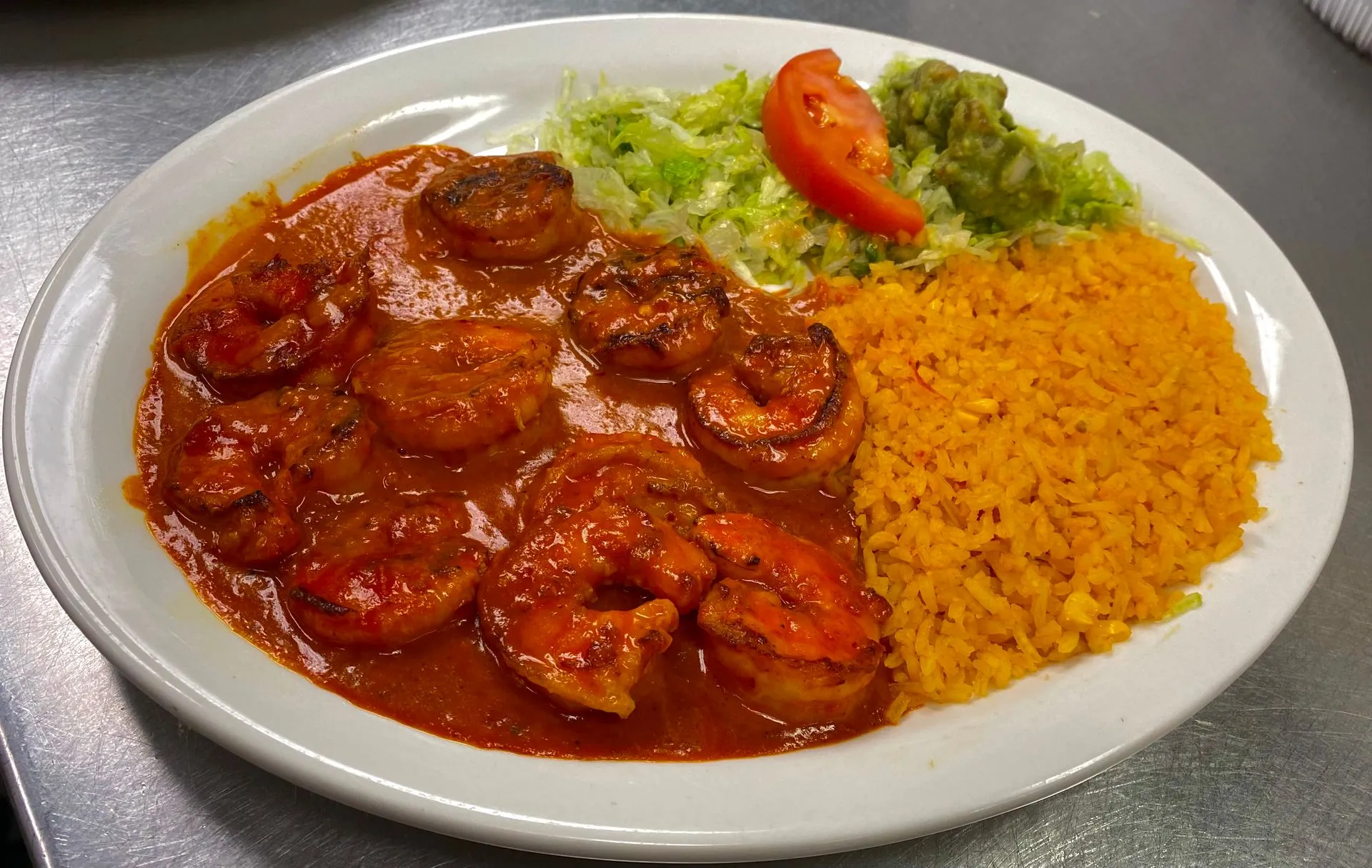 Jumbo shrimps cooked in ancho and guajillo broth with potatoes, carrots, onions, and celery. Served with tortillas.