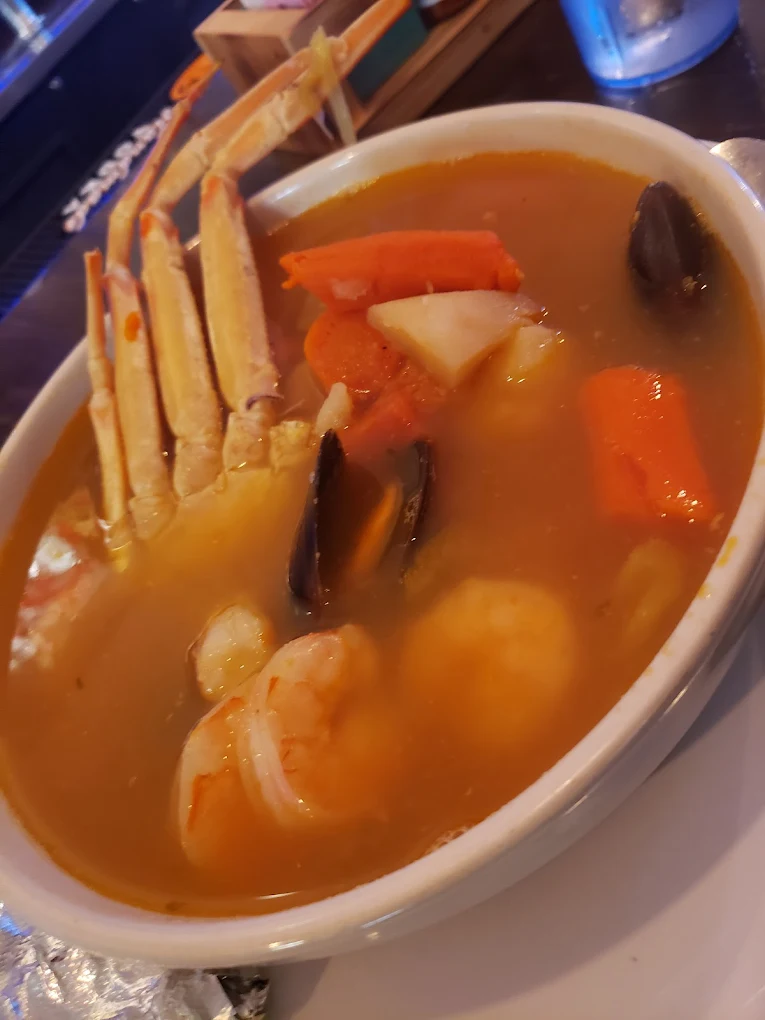 With clams, shrimp, crab legs, squid, mussels, scallops, potatoes, carrots, onions, and celery with tortillas.
