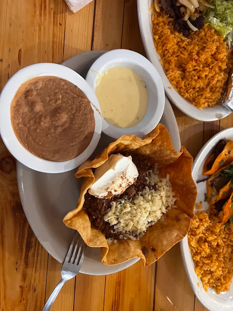 Shredded chicken or ground beef in a crispy flour tortilla, beans, lettuce, tomatoes, crema and queso dip on the side.